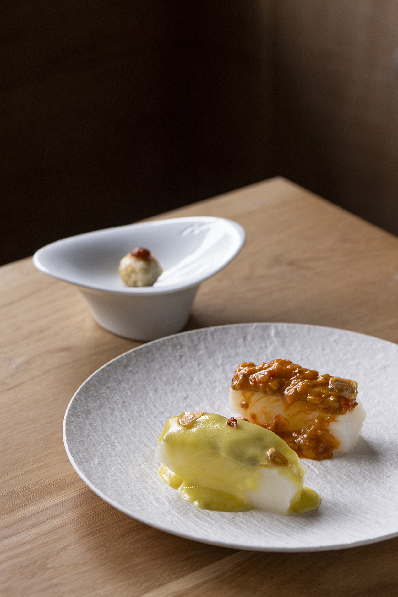 Kokotxas de merluza en emulsión de ajo y cayena.
